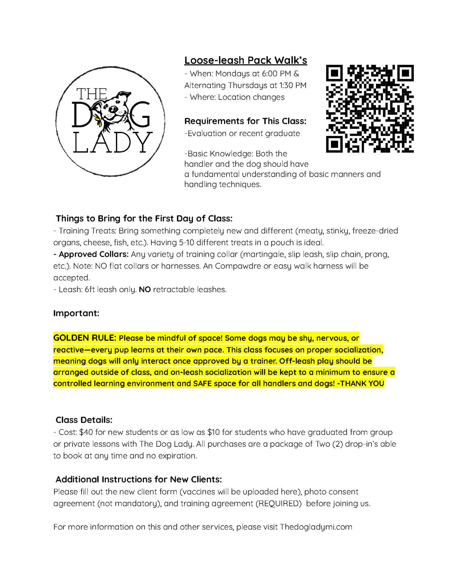 Loose Leash Walking: Join us taking a stroll around town! Combining techniques from the strict heel command, we modify this class to fit your city living needs with a more relaxed but still efficent way to walk your dog. In this class you will excercise your ability to keep your dogs attention on you and not the distractions around you. Your dog will learn how to walk besides you calmly with no pulling, jumping or being so easily distracted.