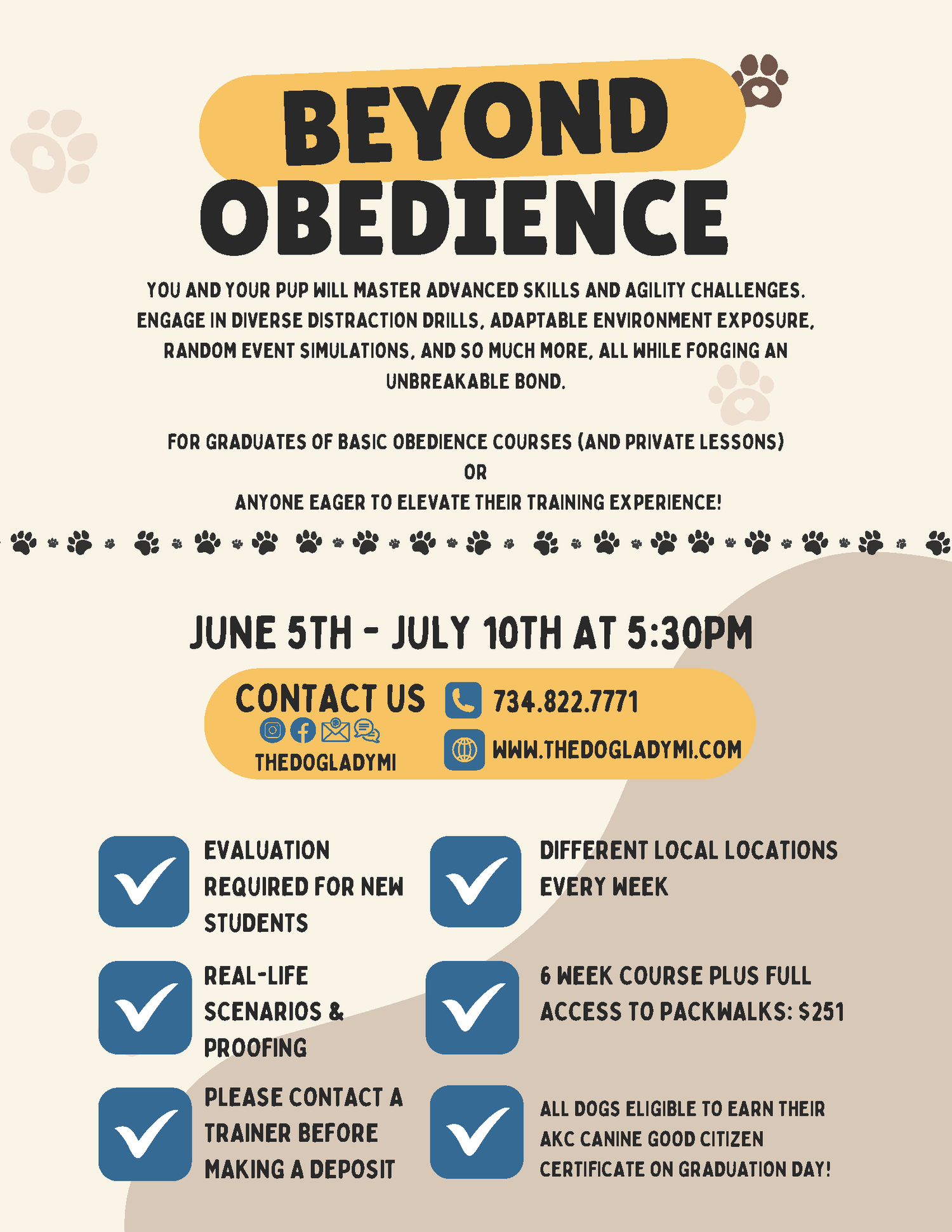 Basic Classes: Join us and learn how to have a better understanding of your dog. In our beginner basic obedience classes you will learn how to keep your dog better engaged with you, focus on recall skills, basic manners around other dogs and humans, and much more.