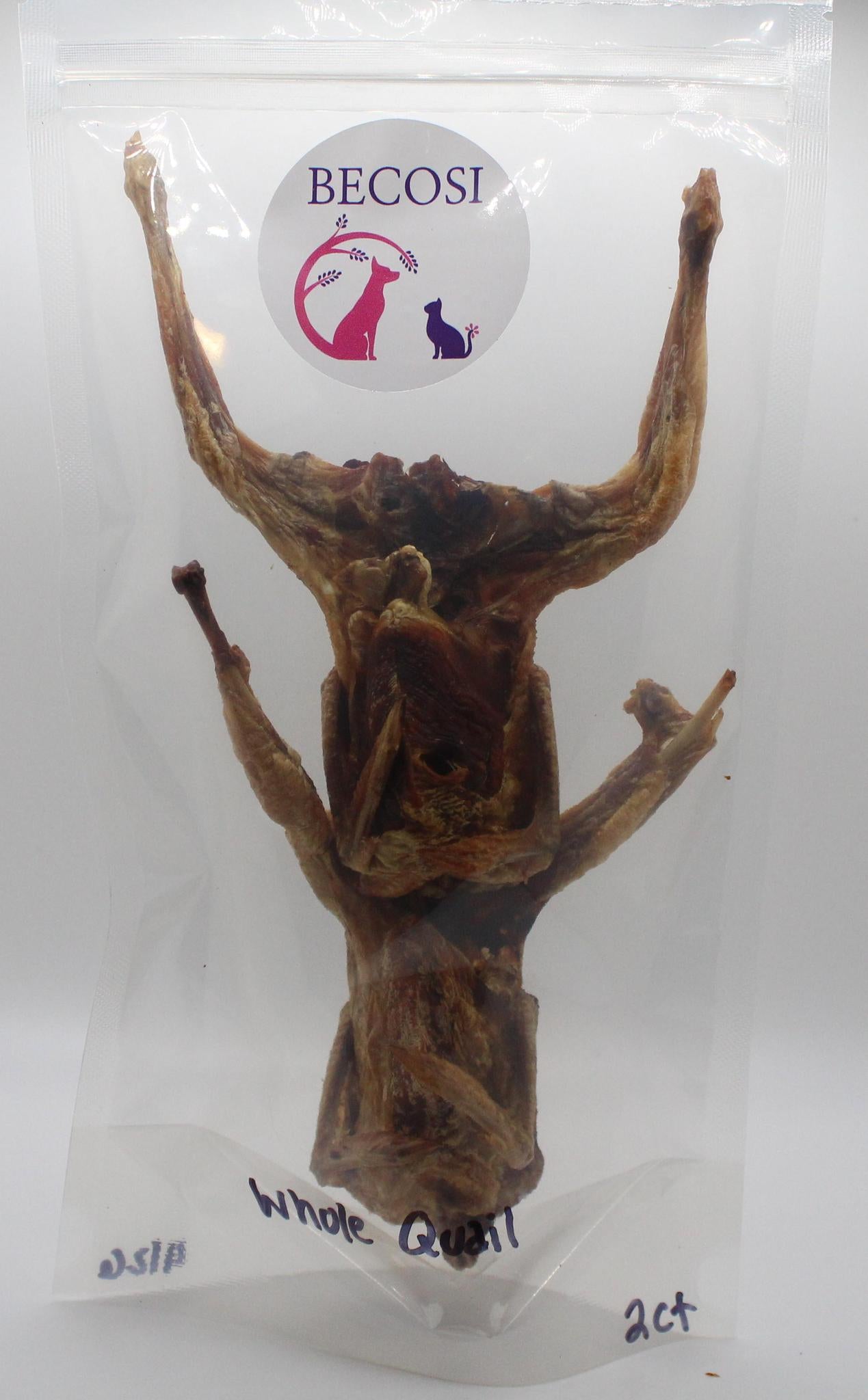 Dehydrated whole quail is a single-ingredient, high protein dog treat or meal component made by slowly drying the entire bird- including the bones, organs and skin. First gently cooked fully to kill any bad bacteria, then dehydrated fully for your convenience. Preserving all the nutrients. Quail is a novel protein source perfect for dogs with allergies and sensitivities.