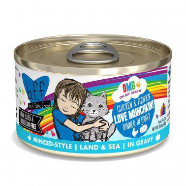 Turn meal time into yum time for your best feline friend with the BFF OMG Love Munchkin! Chicken & Pumpkin Dinner in Gravy Grain-Free Canned Cat Food. Made with chicken broth, chicken, tuna and pumpkin as the top ingredients, plus essential vitamins and minerals, it provides a gravylicious and balanced diet for adult kitties. Since it’s packed with broth, it’s a great way to add much-needed hydration to keep your pal healthy. Plus, it’s made with sustainably sourced ingredients in high-quality food facilities with nothing artificial.