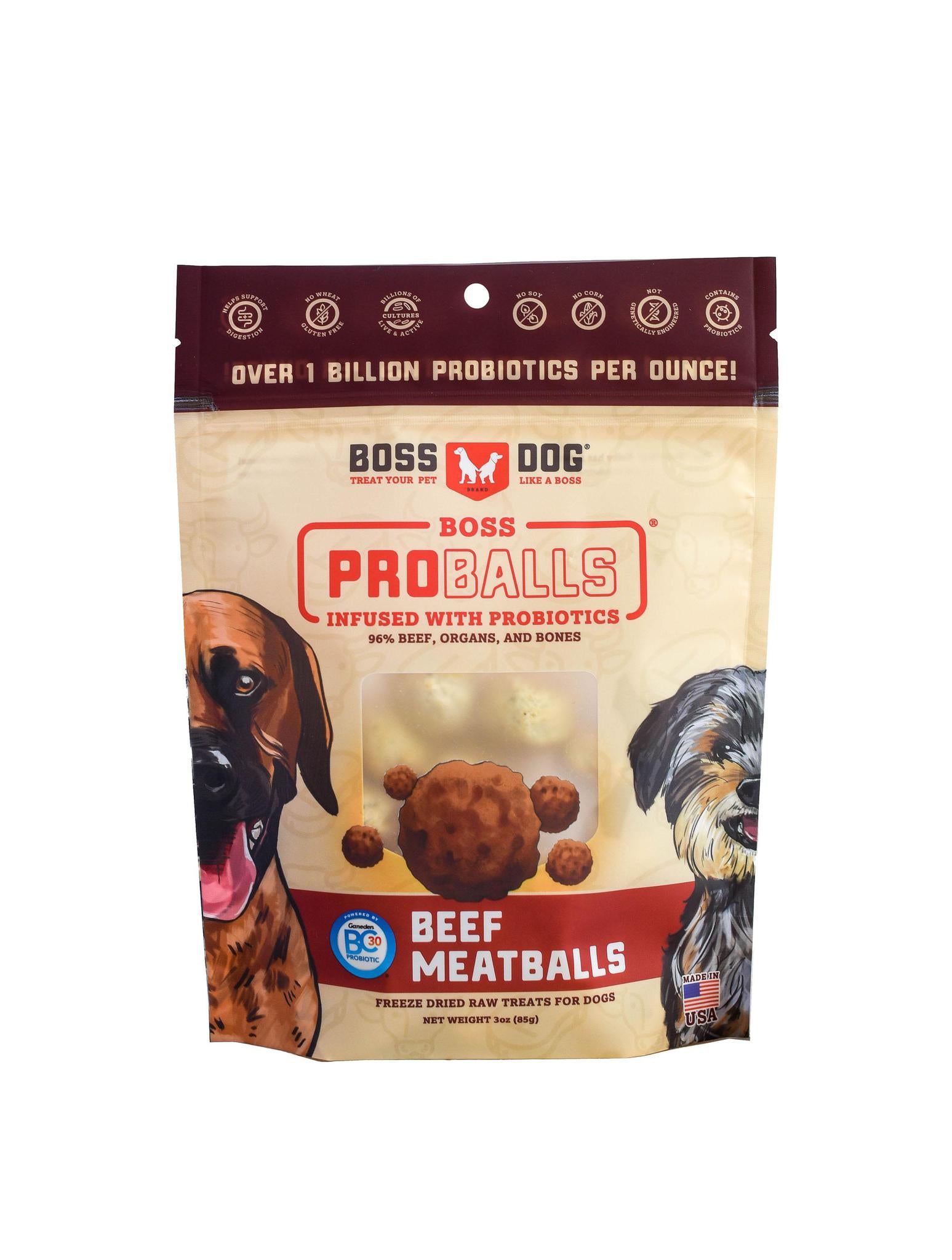 Boss Dog Brand BOSS PROBALLS are protein based treats to support overall health and with a taste your dog is sure to enjoy! These delicious freeze dried raw meatballs are packed with probiotics at over 1 Billion Probiotics per ounce! Free from corn, soy and wheat, you can rest assured that our Boss PROBALLS deliver digestive benefits and contain wholesome ingredients. These treats are meat first and protein rich to provide sufficient nutritional intake in a treat application!
