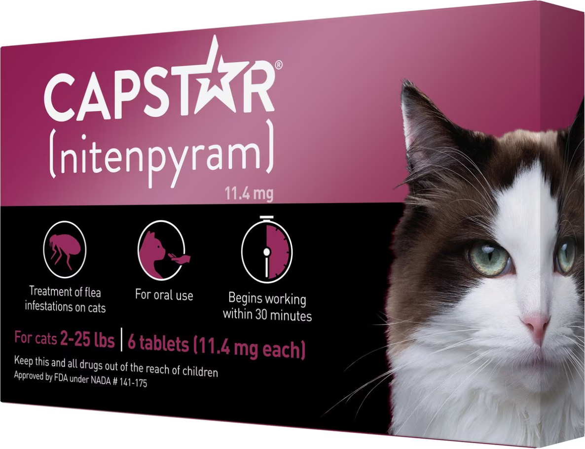 • Capstar (nitenpyram) starts killing adult fleas in just 30 minutes.