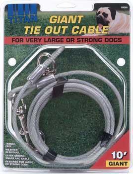 Manufactured from galvanized steel aircraft cable for the strongest dogs around. Gives dogs freedom to roam within a 10-feet area. Weather resistant. Designed to safety secure extra large dogs. Perfect for use with a Titan Giant Tie Out Stake.