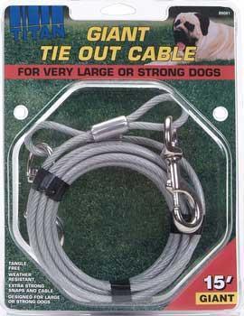 Manufactured from galvanized steel aircraft cable for the strongest dogs around. Gives dogs freedom to roam within a 15-feet area. Weather resistant. Designed to safety secure extra large dogs. Perfect for use with a Titan Giant Tie Out Stake.