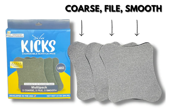 Our changeable and replaceable Kicks provide pet parents the ability to easily file and trim their pets nails. Kicks come in three pairs of different grits, including: Coarse, File and Smooth. For best results let your pet scratch through the roughness sequence while keeping your De' Vora grooming toy in top condition for use.