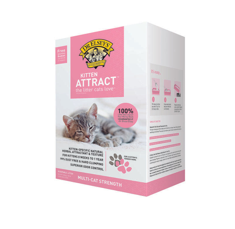 Kitten Attract® is made of premium litter with superior clumping ability and ground to an ideal granule size and texture for a kitten’s tender paws. Kitten Attract® litter contains a kitten-specific natural herbal attractant that piques a kitten’s curiosity to use the litter box. The combination of herbs, texture and particle size provides a unique and effective solution for owners of kittens. Dr. Elsey recommends that after one year owners switch to Cat Attract® to ensure consistent litter box use. Each box has a free Litter Box Solutions Booklet to help cat owners solve their litter box problems.