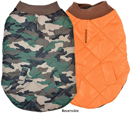 FASHION PET Camouflage Jacket Reversible camouflage jacket is lightly filled for added warmth. Reverses to solid safety orange creating 2 great looks in 1. Brown ribbed collar and leg openings and a leash hole.100 Polyester. Machine wash cold with like colors hang to dry. DO NOT bleach.