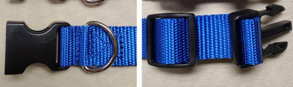 A simple and lightweight collar suitable for most dogs, 1" width on all sizes. We use black plastic hardware for the buckles with a metal D-ring for holding an ID tag and/or attaching a leash.
