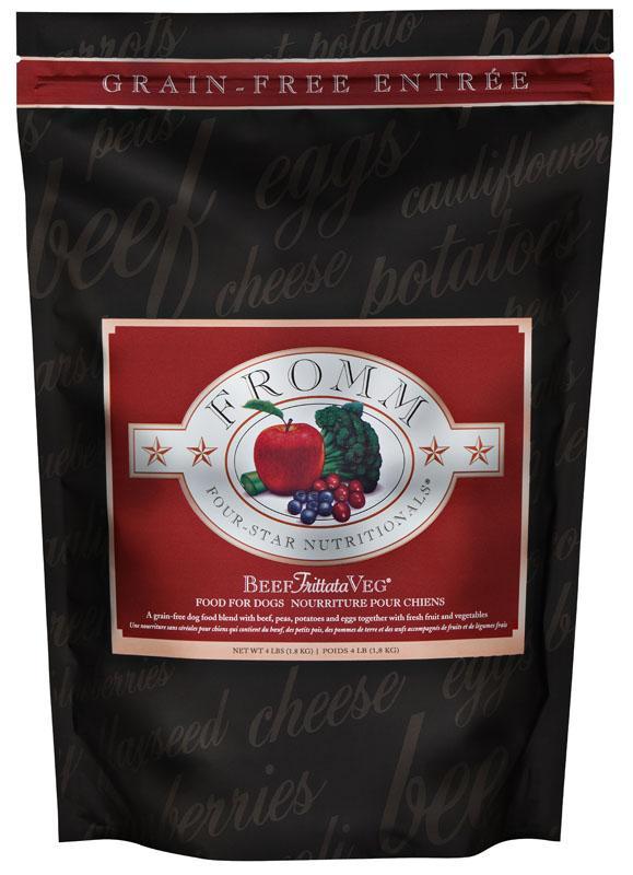 A grain-free entrée with beef, beef broth, lentils, potatoes, and an assortment of fruits & vegetables. Fromm Four-Star Nutritionals® Beef Frittata Veg® Recipe Food for Dogs is formulated to meet the nutritional levels established by the AAFCO Dog Food Nutrient Profiles for all life stages, including growth of large size dogs (70 lb. or more as an adult).