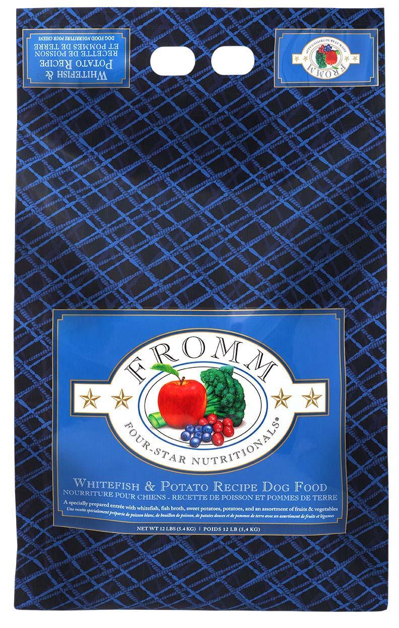 A specially prepared entrée with whitefish, fish broth, sweet potatoes, potatoes, and an assortment of fruits & vegetables