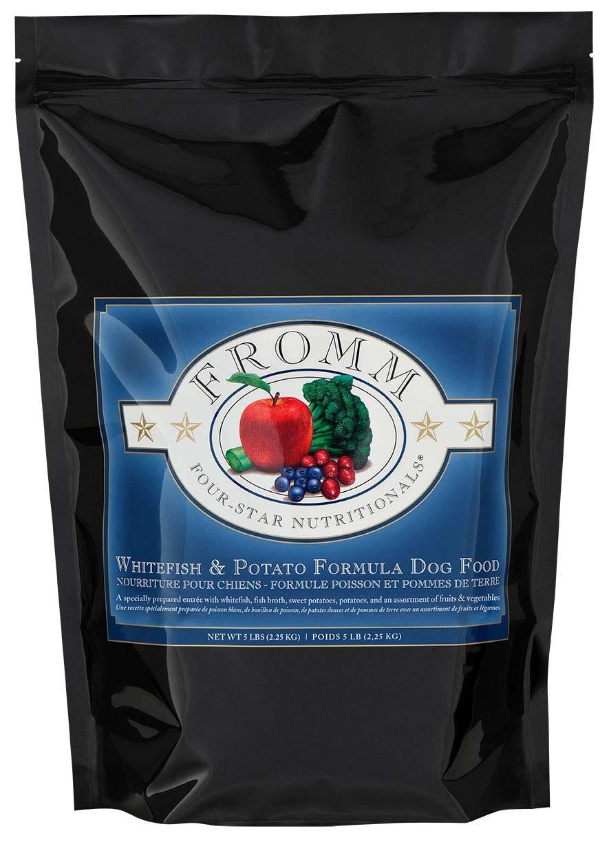 A specially prepared entrée with whitefish, fish broth, sweet potatoes, potatoes, and an assortment of fruits & vegetables