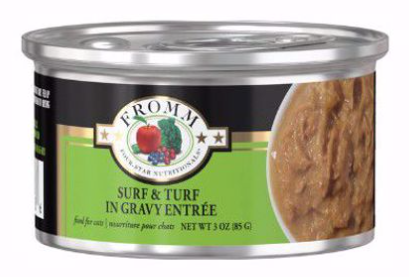 Fromm Four-Star Surf & Turf in Gravy Entrée features a generous portion of shredded chicken and shrimp cooked in gravy with sweet potatoes. The recipe is prepared to ensure consistency, quality, and superior taste. Surf & Turf in Gravy Entrée is complete and balanced for all life stages.