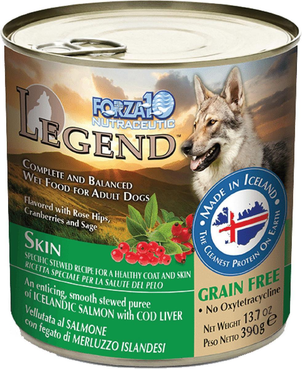 Forza10 Legend Wet Skin is a complete and balanced recipe designed to help support dogs with skin and coat issues, such as hot spots, tear stains, foul odors, scratching, dry and dull fur, constant fur loss, redness, and excessive paw licking. This GRAIN-FREE recipe is made with delicious fine-ground puree of 100% Icelandic salmon and cod liver, and a mix of therapeutic plants and fruit extracts, which naturally provide physical wellbeing in dogs. All selected ingredients are high quality and premium grade. Feel like a great pet parent by giving this super delicious and nutritious recipe to your pup! Best to combine with Legend dry food, thus achieving the best blend of palatability and nutritional support. Forza10's recipes are free from all the bad stuff; never any GMOs, corn, wheat, soy, by-products, oxytetracycline, artificial preservatives, colors or flavors.