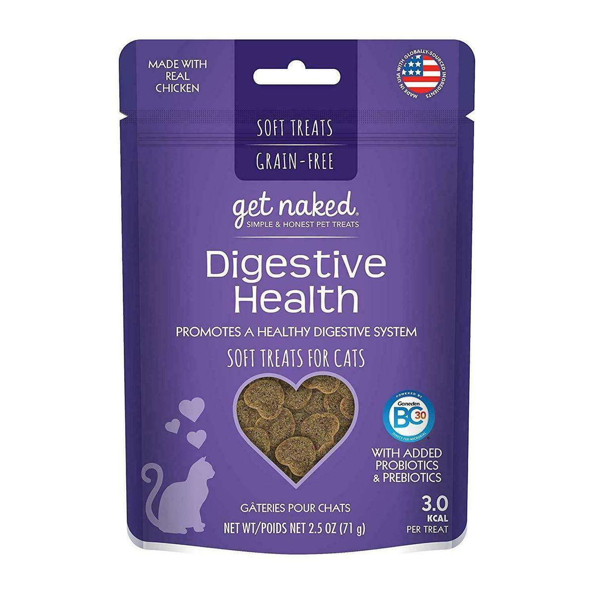 Get Naked® Digestive Health soft treats for cats is formulated with natural dietary fibers and vegetable oils, and fortified with probiotics to nurtures a healthy digestive system. *Recommended replacement product for Get Naked Furball Relief.