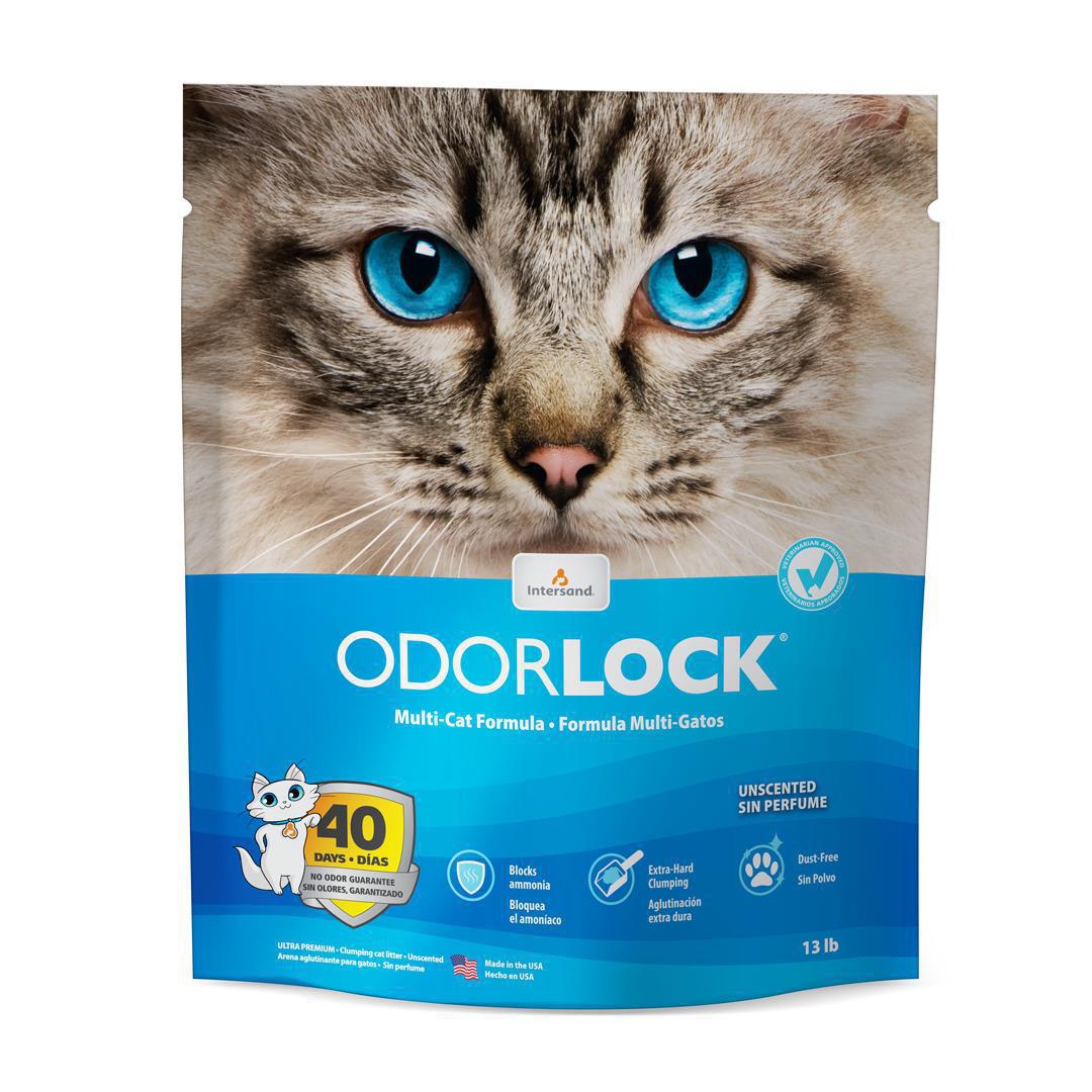 Intersand OdorLock clumping cat litter is made of all-natural clay. Its patented "Smart Odor Shield" technology blocks ammonia release, uniquely neutralizing urine and feces odors for 40 days. This ultra-fast clumping and easy-scooping litter makes litter box cleaning so effortless. OdorLock generates less waste than competing clay litters. Plus, it's 99.9% dust-free, leaving no tracking on floors or furniture and keeping your cat's and your family's respiratory systems safe. It is soft and comfortable for your cat. It is easily carried thanks to its side handle and is manufactured in Quebec, Canada.
