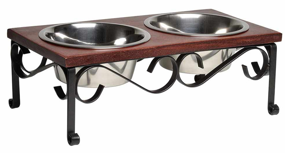 The handcrafted Layton Cherry Top Raised Diner features a black powder coated wrought iron base with a rich cherry stained wood top. All wood surfaces have been protected with a safe and durable water-resistant coating. The Ruff N Tuff stainless steel bowl inserts are veterinarian recommended because they resist bacteria. The bowls are also removable for easy cleaning and are dishwasher safe.
