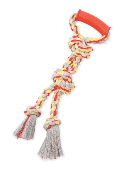 Small 16-Inch Color Twin Tug with Rubber Handle. Made from premium cottonblend rope fibers. Rope fibers floss dogs' teeth as they chew and play. Mammoth Patent design. A tug shape creating interactive play. Includes a rubber handle making it great for tug-of-war. Great for small dogs.