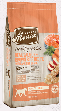 Merrick Healthy Grains Real Salmon and Brown Rice Recipe Dry Dog Food provides balanced nutrition with real whole foods sourced from local farmers we know and trust. This recipe is specially balanced with 53% protein + healthy fat ingredients, so dogs get optimal protein and fiber.