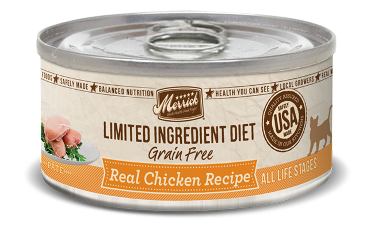 Merrick Grain Free Limited Ingredient Diet Real Chicken Pâté is specially formulated, in a delicious pâté, to provide complete and balanced nutrition for cats with food sensitivities and sensitive stomachs.