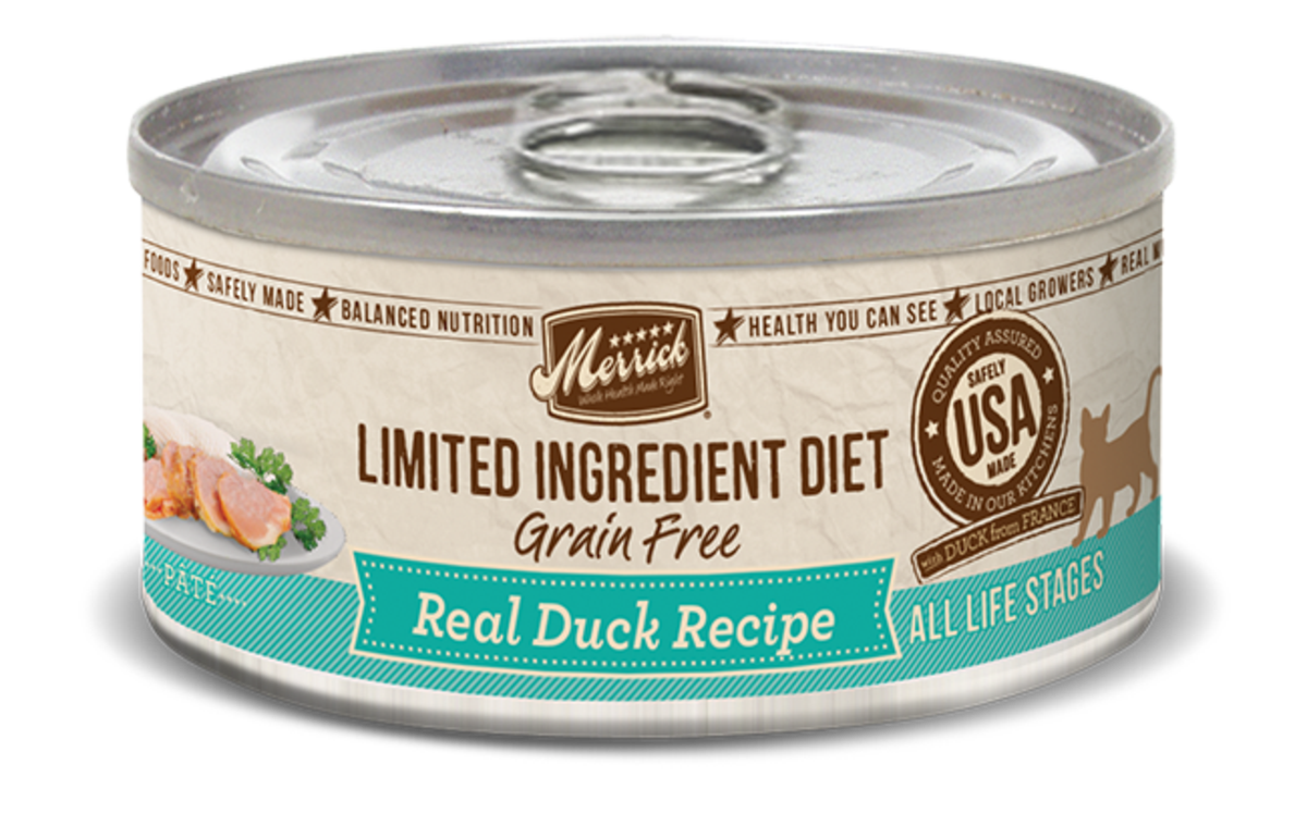 Merrick Grain Free Limited Ingredient Diet Real Duck Pate is specially formulated, in a delicious pate, to provide complete and balanced nutrition for cats with food sensitivities and sensitive stomachs.