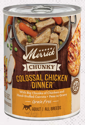 Merrick Grain Free Chunky Canned Dog Food’s first ingredient is always real, wholesome USDA-inspected deboned meat. Made with big chunks of chicken in a mouth-watering gravy, this grain free Chunky recipe will make any mealtime special. All Merrick canned recipes can be served as a topper for dry kibble or a delicious standalone meal.