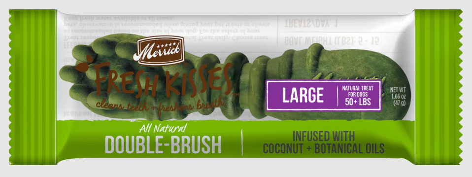 Merrick Fresh Kisses infused with Coconut + Botanical Oils are an innovative, natural dental treat designed not only to clean dogs’ teeth, but to truly freshen breath at the same time. Merrick Fresh Kisses feature a unique double-brush design that cleans teeth, and uses coconut + botanical oils to freshen breath.