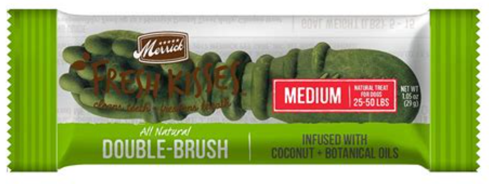 Merrick Fresh Kisses infused with Coconut + Botanical Oils are an innovative, natural dental treat designed not only to clean dogs’ teeth, but to truly freshen breath at the same time. Merrick Fresh Kisses feature a unique double-brush design that cleans teeth, and uses coconut + botanical oils to freshen breath.