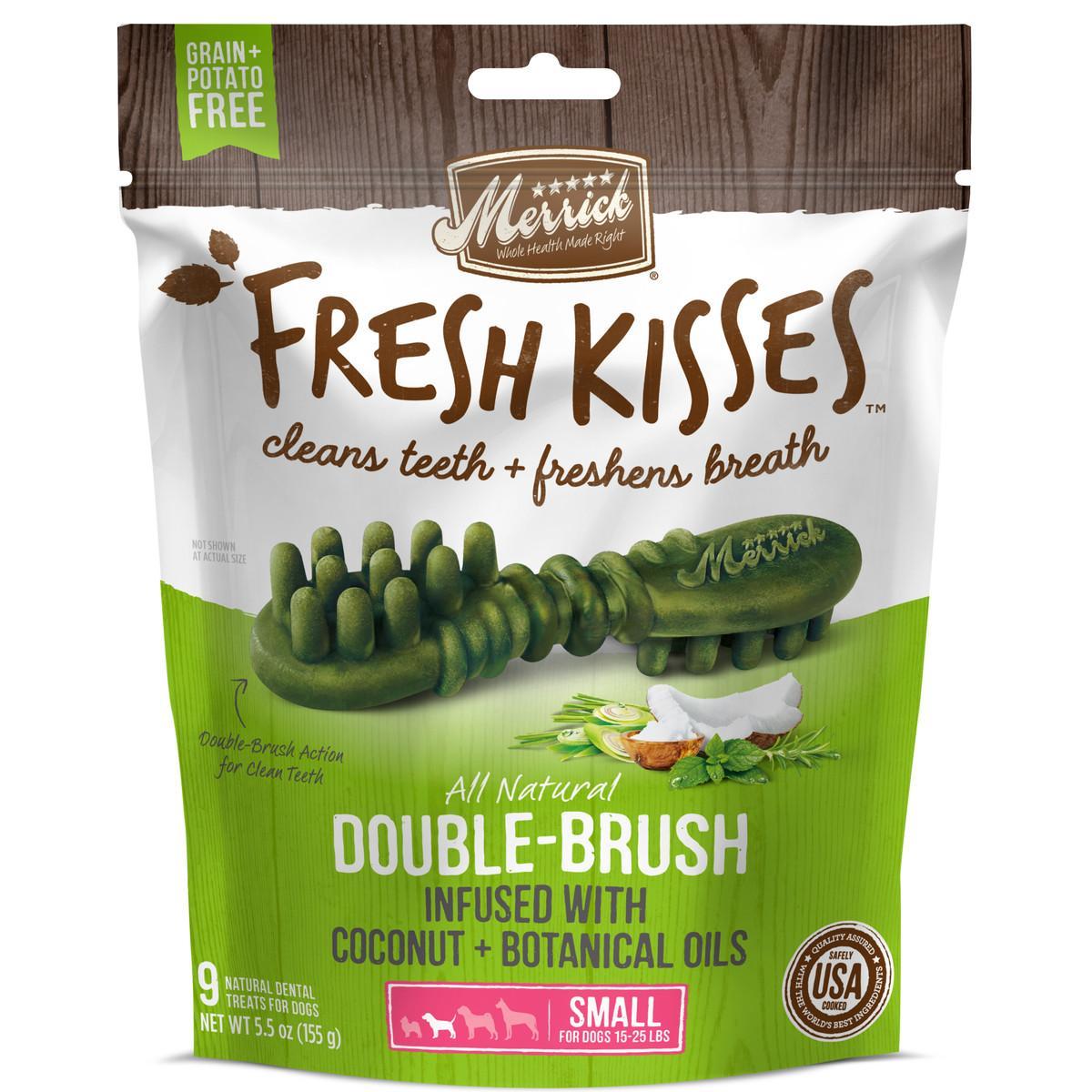 Merrick Fresh Kisses infused with Coconut + Botanical Oils are an innovative, natural dental treat designed not only to clean dogs’ teeth, but to truly freshen breath at the same time. Merrick Fresh Kisses feature a unique double-brush design that cleans teeth, and uses coconut + botanical oils to freshen breath.