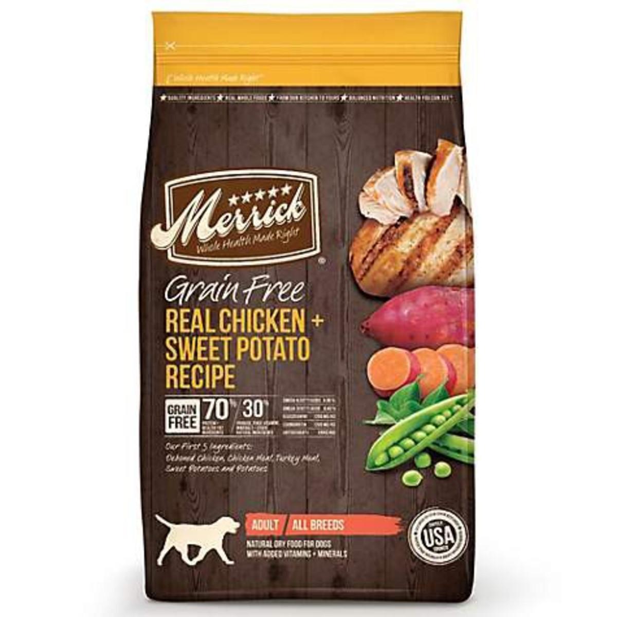 Merrick Grain Free Real Chicken + Sweet Potato Recipe Dry Dog Food provides balanced nutrition with real whole foods sourced from local farmers we know and trust. This natural, grain free formula dog food is ideal for all breeds and sizes of dogs with a focus on naturally nutrient rich ingredients to support overall health.