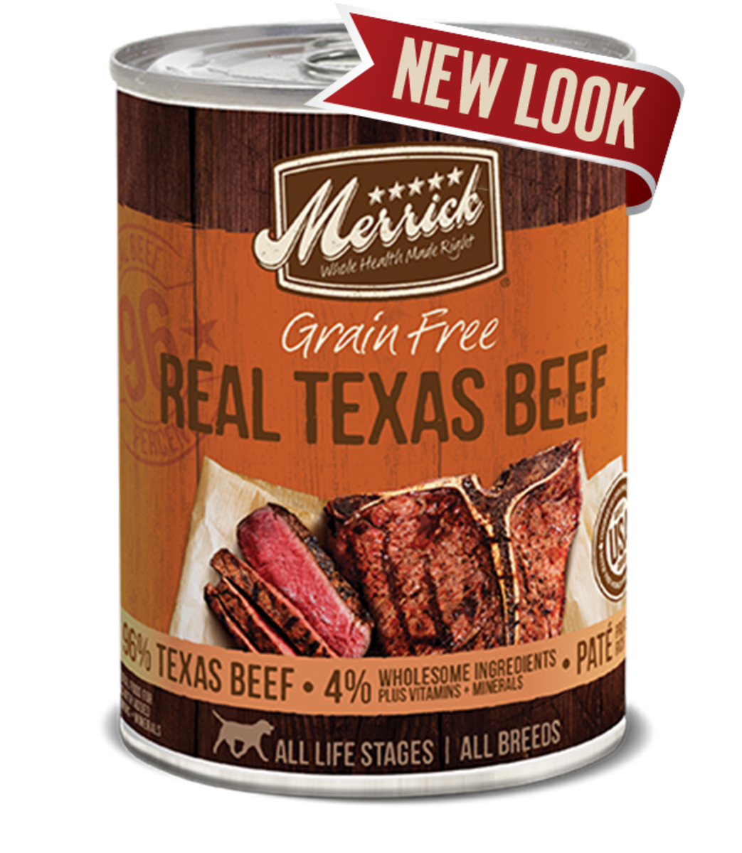 Dogs thrive on quality protein and healthy fats. That is why our Merrick Grain Free Real Texas Beef Canned Dog Food’s first ingredient is real and wholesome USDA-inspected deboned beef. This grain-free, fresh entrée is 96% protein from animal sources with all the vitamins and minerals your dog needs for complete nutrition. Our grain-free canned recipes can be served as a topper for dry kibble or a delicious standalone meal.