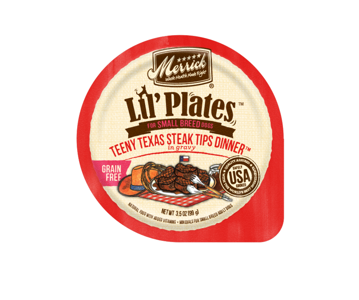 Merrick Lil' Plates Grain Free Teeny Texas Steak Tips Dinner Dog Food features a taste and texture your tiny pup will love. The easy-open trays pack incredible nutrition into convenient, single-servings designed to offer the right sized portion & nutrition for smaller breeds.