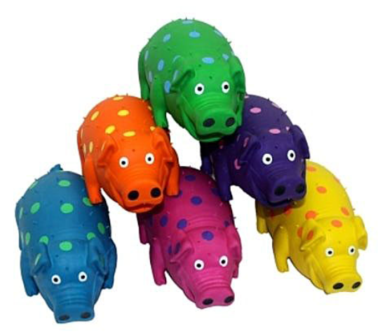 • Plush filled polka dot chicken or pig toy that dogs will love. Available in yellow, pink, green, white, or blue.