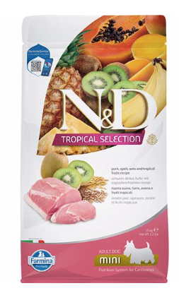 • Farmina N&D Dog Dry Tropical Select Pork Mini is a premium dry food designed to meet the nutritional needs of small breed dogs. This carefully crafted formula features high-quality pork as the primary ingredient, combined with nutrient-rich tropical fruits to deliver a delicious and balanced diet for your pet.
