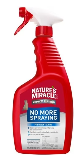 The all natural repellent pet stain & odor remover prevents cats from revisiting and spraying the same spot twice! When used to clean an area previously sprayed by a cat, Nature’s Miracle® No More Spraying eliminates existing stains & odors leaving behind lemon grass and cinnamon scents. These scents repel and prevent cats from returning to the area. Ideal to use when trying to break cats’ spraying habits, No More Spraying will repel cats while eliminating tough deep-set urine stains & odors. Safe for use around pets and home, when used as directed.