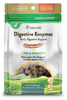 The NaturVet Scoopables Digestive Enzymes Cat Supplement is a su-purr tasty way to support your furbaby’s digestive tract. It’s paw-fect for kitties with sensitive stomachs, for use during food transitions and for daily digestive support. Prebiotics, probiotics and digestive enzymes help to nourish the natural bacteria in your cat’s gut, helping her to better digest food and absorb essential nutrients. This supplement is packed with tasty salmon flavor, so it’s purr-fect for even picky kitties.