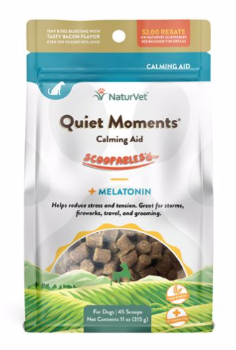 With the NaturVet Scoopables Quiet Moments Calming Aid Dog Supplement, you can promote a calming effect during stressful situations for your furbaby. Thiamine and L-Tryptophan help to reduce stress and tension. Melatonin helps to promote rest and relaxation, and ginger helps to settle sensitive tummies, which is extra important during travel. This supplement is paw-some for events like fireworks, storms, travel and grooming. It’s bursting with tasty hickory smoked bacon flavor, so it’s paw-fect even for picky pups.