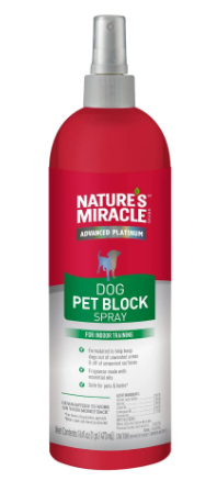 Nature's Miracle Pet Block Repellent Spray is formulated to keep pets away from treated areas. The formula contains natural repellent scents which pets dislike and prefer not to smell. The aversion to the product's scent is what causes pets to stay away from treated areas. Long-lasting, concentrated formula is designed for both indoor and outdoor use. Safe for use around pets and home, when used as directed.