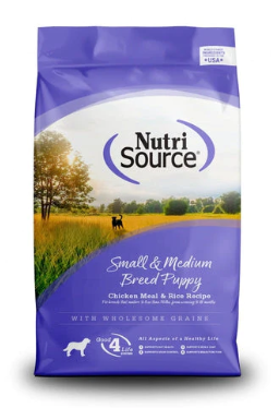 NutriSource® Small and Medium Breed Puppy Chicken and Rice Formula is ideal for growing small and medium breed puppies (breeds that mature at less than 50 lbs.). NutriSource® Small and Medium Breed Puppy Food contains the higher levels of protein and fat needed by small and medium breed puppies and is formed to smaller bite size shapes making it easier for small dogs to eat. NutriSource® is made with real chicken and no chicken by-products. NutriSource® combines chicken rice and carefully selected ingredients in the precise blend to promote balanced growth and optimum health for small and medium breed puppies. NutriSource® Small and Medium Breed Puppy food also supplies complete and balanced nutrition for gestating and lactating females. Feed NutriSource® Small and Medium Breed Puppy food to your Small/Medium Breed Puppy from weaning until your dog reaches its mature body weight and size usually at about one year.