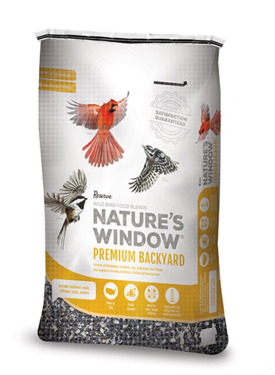 Nature’s Window Premium Backyard wild bird food is a limited ingredient blend that features high-quality black oil sunflower seeds and no corn, milo, millet or wheat. Premium Backyard is a favorite of chickadees, cardinals, jays, nuthatches and titmice. This wild bird food blend also appeals to finches, grosbeaks, siskins and woodpeckers.