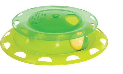 Petstages Catnip Chase Track cat toy is designed to keep your kitty active and engaged while playing indoors. Great for one or more more cats! This fun, brightly colored toy features a spinning ball that your kitty will have a great time chasing along a circular track. Peek-a-boo openings provide glimpses of the ball as it races around enticing your cat to bat and paw! This toy also includes a refillable catnip compartment to get your kitty excited for play time. A free bonus fill of catnip is included. Clean with warm water, mild soap and rinse. Dry before refilling center compartment with catnip.
