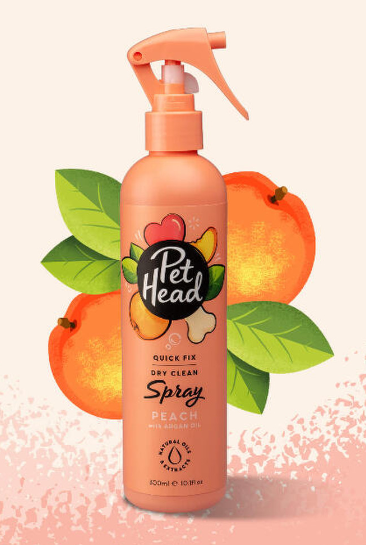 • Dry clean spray shampoo is paw-fect for cleaning your furbaby on the go and features a peach fragrance.