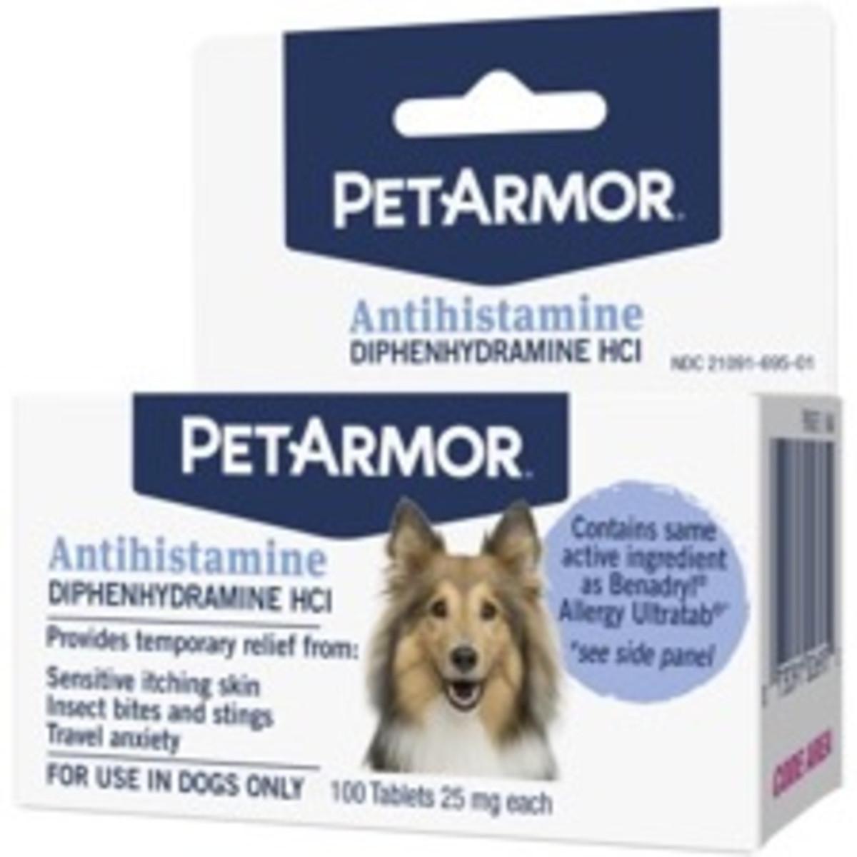 • Give your dog fast, effective relief with one dose of PETARMOR Antihistamine Tablets. It’s your easy-to-use in-home solution that helps relieve their sensitive itchy skin and soothe insect bites and stings. It has same active ingredient as BENADRYL Allergy ULTRATABS*. YOU ARE YOUR PET'S ARMOR. *BENADRYL and Allergy ULTRATABS are registered trademarks of Johnson & Johnson. Johnson & Johnson is not the distributor or manufacturer of PETARMOR Antihistamine.