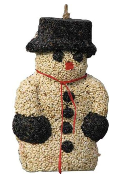 With its adorable presentation, this Snow Man Shaped Suet makes a great gift - just hang and enjoy the birds. Use as an ornament then hang this snow man outside for an instant birdfeeder. Attracts a variety of birds including Cardinals, Jays, Finches, Nuthatches, Grosbeaks, Chickadees and more. All natural ingredients. No fillers and no chemical preservatives. Dimensions: 2"D x 6"W x 9.5"L and weighs 1.8 lbs.