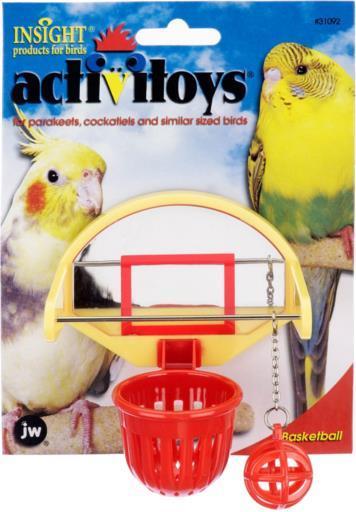 The JW® Pet ActiviToy® Birdie Basketball Bird Toy is a crowd favorite with all pet birds. This interactive bird toy will definitely score you at least two points for providing this brightly colored bird toy, which is great for the stimulation and exercise needed for your pet bird's well-being. A shiny, reflective backboard will help to keep your bird engaged, and challenged mentally and physically as they try to put the basketball into the tiny hoop. Birds love toys with moving pieces and parts that give them an entertaining task to complete. Perfect for parakeets and parrots because they can see to their sides, front and even have a partial view of what is happening behind them because of the mirrored surface. Easily attaches to wire cages. Great for cockatiels, parakeets, and similarly sized birds.