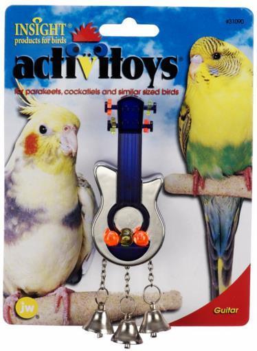 The Activitoy Guitar will bring out the rebel rocker in all little birds. This interactive toy features tiny plastic beads that spin around the head of guitar for lots of in-tune fun. Raised plastic strings, beads, bells, balls and chains offer multiple textures to stimulate and engage birds using natural behaviors. Three bells dangle from the instrument's base, attached to beads that can be pulled up to make them ring. Birds can watch their own performance reflected in the metallic body of the guitar.