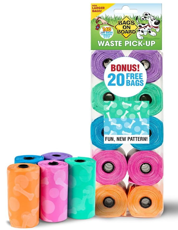 Even the cutest pets can leave some not-so-cute messes. Bags on Board Fashion Print Dog Waste Bags Refill Pack, now with a larger bag size (9 in x 14 in), comes in 5 trendy and stylish colors (pink, lavender, sage green, turquoise, and apricot) with a new, fun polka-dot and bone pattern. And, you get 20 free bags. Bags on Board makes picking up your pet waste quick, simple, and easy whether you're on a walk or in the backyard. Our dog poop bags are strong, durable, and 100% leak-proof guaranteed thanks to the double-sealed construction. Bags on Board waste bags refill and fit all Bags on Board dog waste bag dispensers, so you do not need to buy a new one. 100% money-back guarantee.