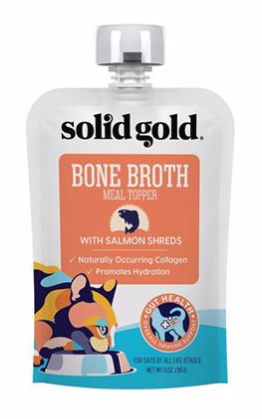 Cats go wild for the nutrient-rich goodness of Solid Gold's Bone Broth Salmon Shreds Grain-Free Wet Cat Food Topper! Made with real chicken bone broth as the very first ingredient, along with premium shreds of salmon, this recipe is packed with the protein your kitty needs and the savory taste he loves. And it even features naturally occurring collagen protein, which is filled with amino acids to support gut health and promote healthy hydration!