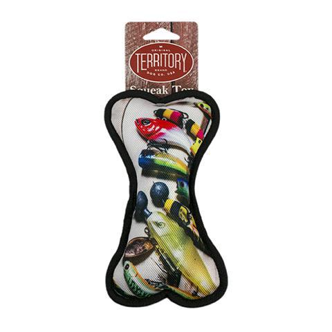 Mark Your Territory this summer with Original Territory's Fishing Lure Bone Dog Toy! This dog toy is made with durable materials such as reinforced fabric for long-lasting interactive play. In addition, we've also added a squeaker for exciting search-and-find fun. Great for fetch, tug-of-war, and other supervised play fun, summer will never of-fish-ially feel over with this toy!