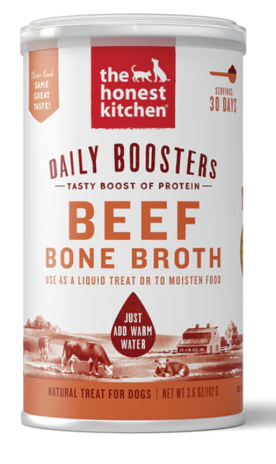 Give your dog a daily boost of superfood nutrients with this easy-to-make Instant Beef Bone Broth. Simply mix with warm water to give your pet a mouthwatering drink, pour over kibble as a delectable gravy, or use it to rehydrate an Honest Kitchen meal to make dinner even more richly flavorful. This Instant Beef Bone Broth with nourishing parsley, warming pumpkin, and turmeric is oh-so-satisfying to your pet’s taste buds.