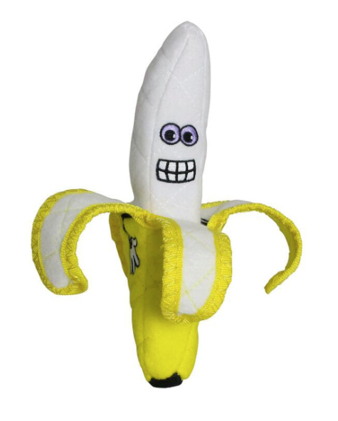 This Tuffy Funny Food Banana Squeaker Dog Toy is among the most durable dog toys on the market! With up to 4 layers of material, this toy is bonded and sewn together for added durability. Most dog toys have just one seam to hold the toy together. Tuffy toys can have up to 7 rows of stitching. A protective webbing is sewn around the outside edge to cover the seams of the toy and make the toy even stronger. This toy is built to last, but keep in mind that no toy is indestructible. Tuffy toys are designed to be used for interactive play and are not chew toys.